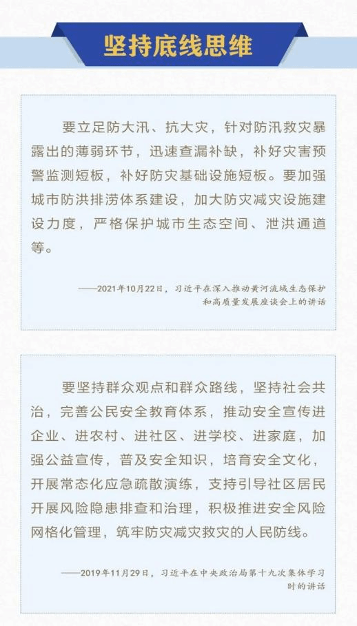 党的十八大以来,习近平总书记对防灾减灾救灾工作多次发表重要讲话,作出重要部署,强调要坚持人民至上、生命至上,始终把保障人民群众生命财产安全放在第一位,不断健全防范化解重大风险体制机制,加快构建抵御自然灾害防线,全面提高重大自然灾害抗御能力。切实减轻灾害风险,直接关系人民群众生命安全,关系经济社会安全,是共享全面小康硕果、守护美好家园的重要基石。要加强工作组织领导,加大宣传解读,教育和提醒社会各界牢固树立底线思维和风险意识,坚持问题导向,坚持关口前移,加强自然灾害防治能力建设,加大灾害风险隐患排查整治力度,从源头上防范和化解安全风险,真正把问题解决在萌芽之时、成灾之前,持续筑牢安全发展基础,为迎接党的二十大胜利召开营造安全稳定环境。