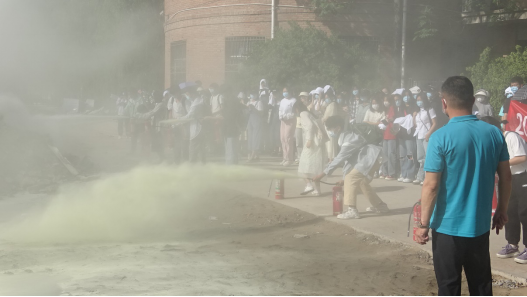 理论学习结束,消防演练在教学楼后的空地开展。通过认真学习观摩马建军的灭火操作技术,同学们积极学习并按照示范的步骤和方法将浓烟大火迅速扑灭,亲身体验了现场灭火的过程。