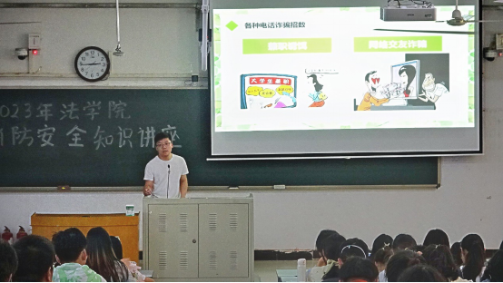 赵帅老师重点为同学们讲解了预防诈骗的相关知识,他从四个维度详细讲述了各种诈骗方式,又从“什么是诈骗”、“诈骗的常见形式”等方面,向同学们全方位介绍了预防诈骗措施,进一步提高了同学们对电信网络诈骗的识别能力和防范意识。此外,赵老师也结合真实案例,提醒同学们遇到类似情况一定要做到不轻信、不上当、保护好个人信息。